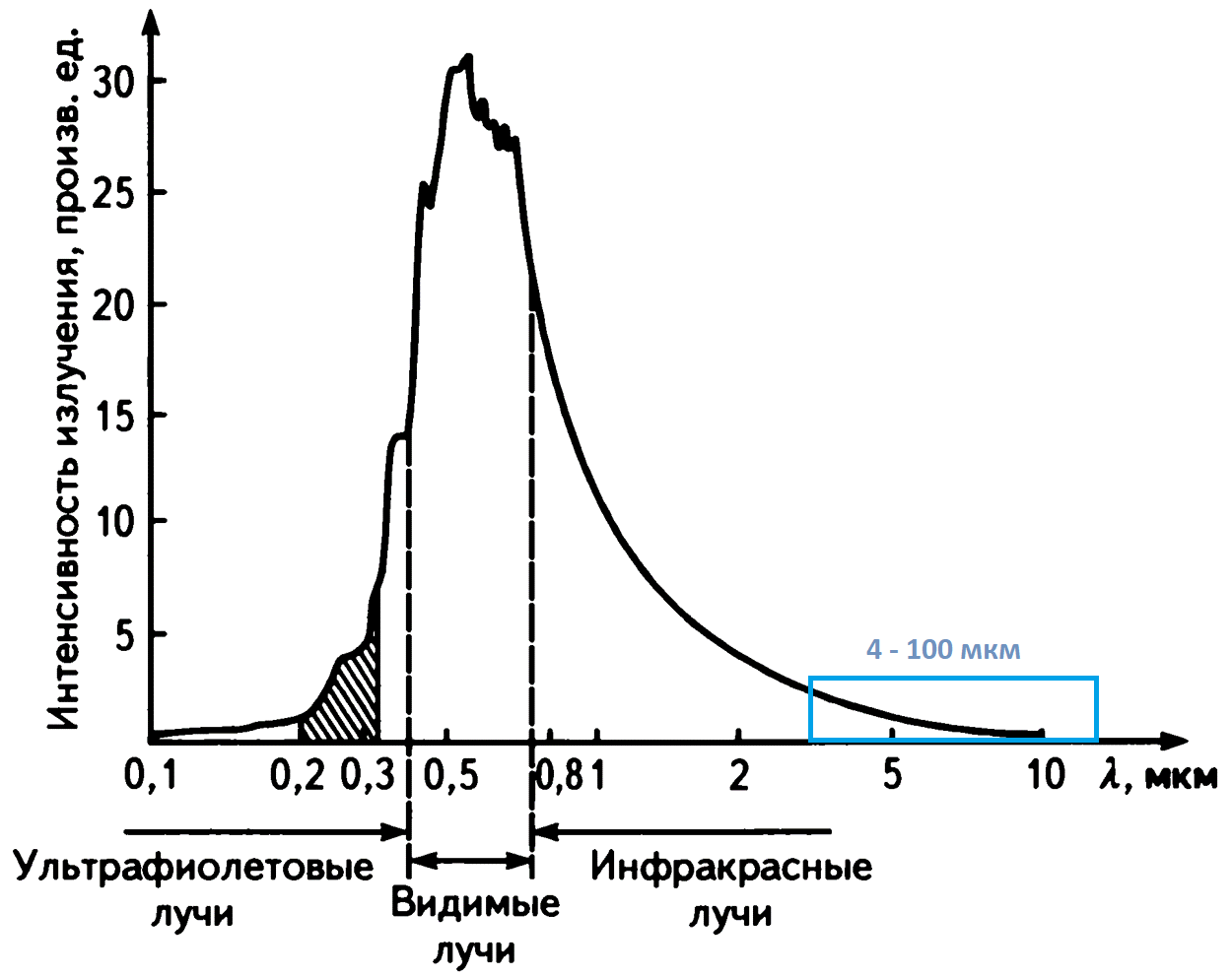 Обратим внимание: на этот интервал приходится менее 1 % интенсивности солнечного излучения, но практически 100 % интенсивности излучения Земли и ее атмосферы!