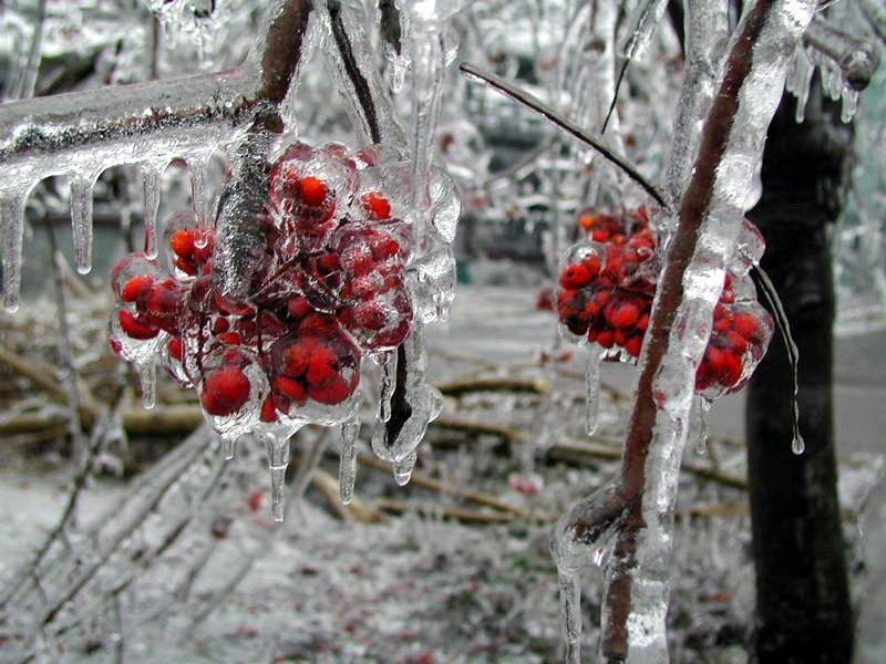 Гололед покрывает не только горизонтальные, но и вертикальные поверхности — цокольные части зданий, деревья.